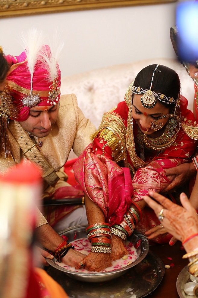 While the Punjabi brides are always spotted in a typical cream and red chooda, the chooda to a Rajasthani bride varies in different patterns in different regions. It is either a pail cream chooda in ivory or ivory bangles that are painted in red embellished with gold or even a combination of red and green ivory bangles.
